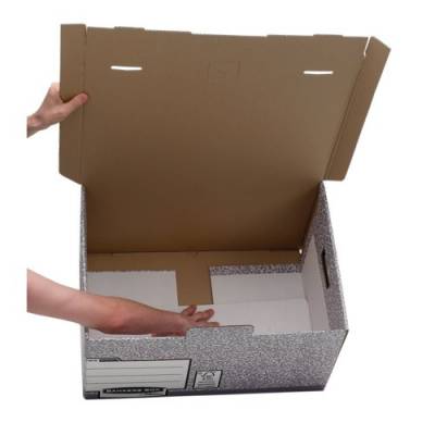 The box also features a triple layer of board on the end panels and a double layer on the front and base for durable, long lasting archive storage. The box can hold ring binders, lever arch files and Bankers Box 120mm transfer files.