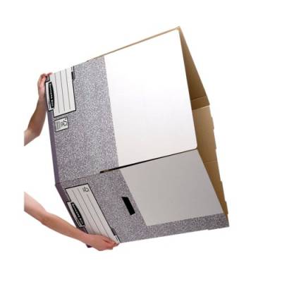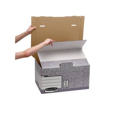 This Bankers Box heavy duty storage box features a hinged lid with a locking tab for security and time saving Fastfold assembly.