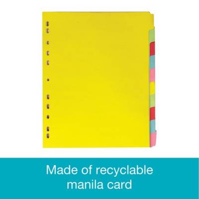 These environmentally friendly Elba 10-part dividers are made from 100% recycled 160gsm manilla and are multi-punched to fit into A4 landscape ring binders and lever arch files, with the extra wide size allowing the dividers to remain visible. Ideal for filing and organising project work, reports, presentations and more, the multicoloured tabs can be either written or typed on for quick reference. This pack contains 1 set of A4 extra wide 10-part dividers.