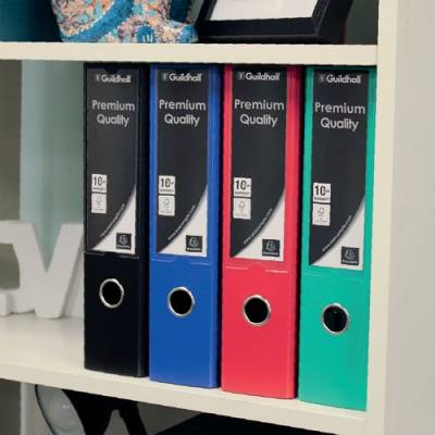 - This durable Guildhall A4 polypropylene over board lever arch file features a 80mm filing capacity for up to 650 sheets of paper, large spine label for easy identification of contents and a finger hole for easy retrieval from a shelf. Ideal for implementing a colour coordinated filing system at home or in the office, this pack contains 10 blue lever arch files.