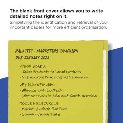 These Exacompta Guildhall square cut folders are made from durable 315gsm manilla and are ideal for desktop organisation or suspension filing. The foolscap folders can hold up to 100 sheets of 80gsm A4 or foolscap paper and measure 349 x 242mm. Ideal for colour coordinated filing, this pack contains 100 yellow square cut folders.