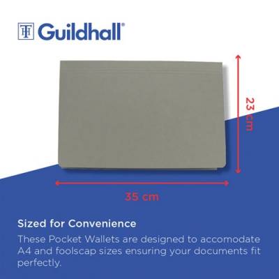 - This Guildhall pocket wallet is made from premium quality 315gsm manilla and features a full flap for additional security of contents. The wallet has a 35mm gusset and can hold up to 350 sheets of A4 or foolscap paper. This pack contains 50 grey wallets, ideal for colour coordinated filing.