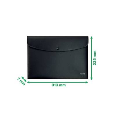 From the Leitz Recycle range, an eye-catching, premium quality plastic document wallet for every day use in school, office and home with push button closure to prevent documents from sliding out. Made from 80% recycled plastic, climate neutral, 100% recyclable and with Blue Angel environmental certification. This robust and practical document wallet perfectly complements other products from the Leitz Recycle range and is made to last. Modern and contemporary green stationery that will look great at home and the office. With the eco friendly Recycle range from Leitz you can both improve your office environment and the environment of our planet. Label only - no packaging waste. Pack contains 10 black document wallets.