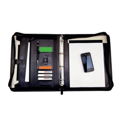 - This Monolith leather zipped conference folder is great for meetings and presentations. Use with an A4 pad to make quick notes on the go, and then file those notes into the sturdy 4 ring binder. Unpunched documents, tablet, business cards and CDs/DVDs slip neatly into the internal pockets. The zipped edge closure helps keep all your documents safe and secure.