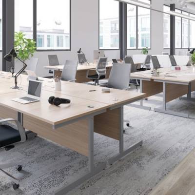 Suitable for use in a variety of office environments. This Jemini Rectangular Cantilever Desk features a strong cantilever frame for support and stability. The desk features a Top Thickness: 25mm with dual 62mm cable management ports to keep workspaces tidy and free from wires. The desk includes a modesty panel as standard and is suitable for use with Jemini Under Desk Pedestals.