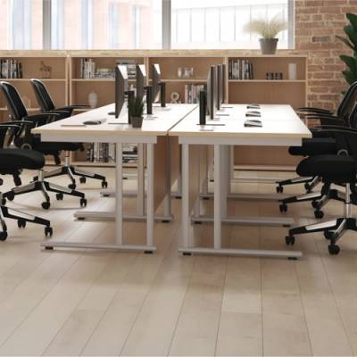 Suitable for use in a variety of office environments. This Jemini Cantilever Desk features double upright legs for improved stability, with height adjustable feet up to 10mm. The radial design offers easy working access to your computer, as well as ample additional desktop space. The 25mm thick MFC desktop features 2mm edge banding and 80mm dual cable management ports. The desk includes a modesty panel as standard and is suitable for use with Jemini Fixed Pedestals on the 800mm end.