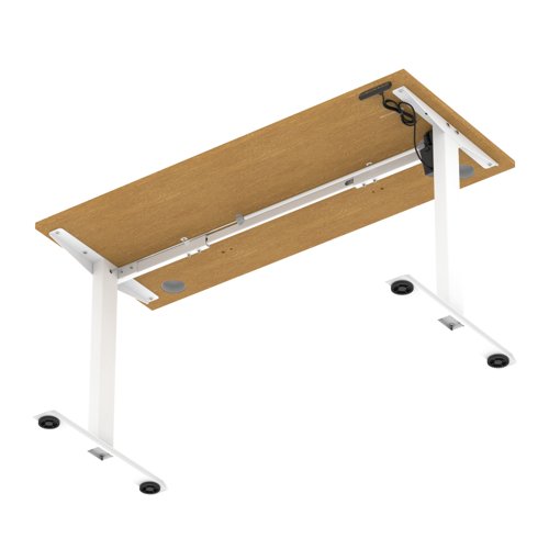 Air Lite 1400 x 600mm Height Adjustable Office Desk Oak Top Cable Ports White Leg
