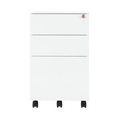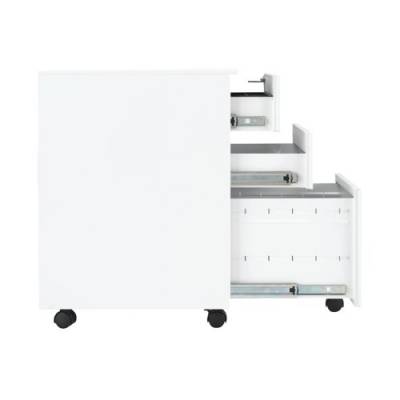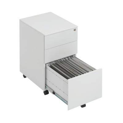 This entry level First mobile steel pedestal features 2 stationery drawers and 1 filing drawer suitable for use with A4 suspension files. The tough steel carcass features an anti-tilt mechanism, allowing only 1 drawer open at a time. This pedestal measures W380 x D470 x H615mm and comes in white with an integrated handle design.