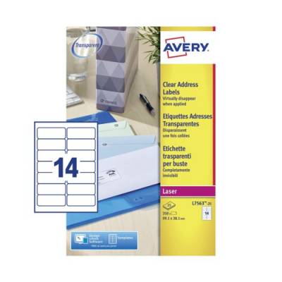 - Create the illusion of having printed to each surface individually with Avery clear laser labels. The edges almost disappear completely upon application giving the impression that the text is printed directly onto white, coloured or textured surfaces. Compatible with Avery's free template software, create professional looking labels anywhere. Developed for use with your laser printer, these labels are designed with JamFree and Smudge FREE technology to ensure easy, hassle-free creation. There are 25 sheets with 14 labels per sheet (350 labels in total).