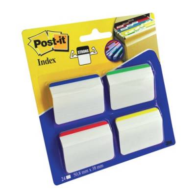 These Post-it Index Angled Filing Tabs provide an easy way to mark and highlight important information in an instant. With Post-it removable adhesive, you can easily apply, remove and readjust the index tabs as necessary, whether you're highlighting parts of a document or marking relevant pages in a book. The extra large tabs measure 50.6 x 38mm (2 x 1.5 inch), providing a larger area to write on and are angled for easy reference. The durable, extra thick tabs are designed for long lasting use. This pack contains 24 index tabs with blue, yellow, red and green coloured tips.