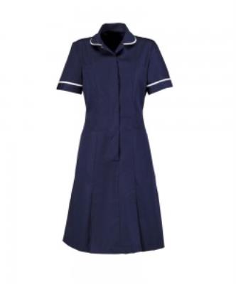 Nurse's dress in step-in style suitable for all healthcare professions with piped collar and cuffs. Features a concealed zip front, hip and chest pockets and double action back and front skirt pleat for ease of movement. Sailor navy/white, royal/white, hospital blue/white, pale blue/white, lilac/white and aqua/white now available up to chest size 148cm.