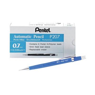 - The professional Pentel P200 Automatic Pencil is designed for technical designs drawing and writing with a consistent 0.7mm line width and no need for sharpening. Supplied with 6 super Hi-Polymer refill HB leads for long lasting use the pencil also features a convenient built-in eraser. This pack contains 12 pencils with blue barrels.