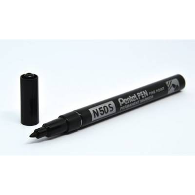 - Inside the robust aluminium barrel of each Pentel N50S permanent marker is quality Pentel indelible ink that writes smoothly on almost any surface from plastic and metal to glass. The fine bullet tip is ideal for general purpose use in industry or commerce. The 3.18mm bullet tip writes between 0.5-1.0mm line width. This pack contains 12 black markers.