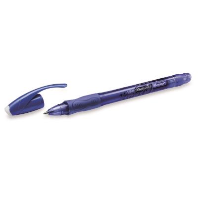 BIC Gelocity Illusion is a medium point; blue ink; erasable gel pen which employs thermosensitive technology offering its user the ability to write; erase and re-write. Its transluscent barrel features a decrative wrap and a textured rubber grip.