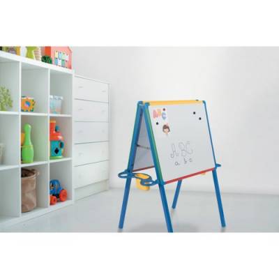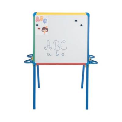 | Kids can write-erase-rewrite, show items with magnets, and also draw on paper sheets with this double-sided standing easel |