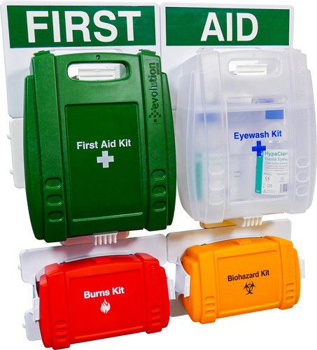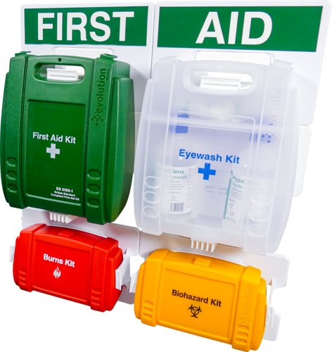 A comprehensive First Aid Point for managing a wide range of Workplace Accidents and Emergencies, Dimensions: Medium - 60 x 56cm, It includes a First Aid Kit, Eyewash Kit, Biohazard Kit and Burns Kit, Ideal for Workplaces with large number of Employees, The Evolution Series is the market leader in first aid kit design and content, developed specifically for the UK, British Standard Compliant